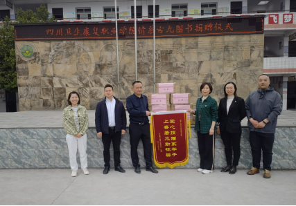 李华代表学校向富顺县古佛镇九年制学校捐赠人文社科和自然科学类等儿童读物若干,协助打造学校图书阅览室,助力校园文化建设。古佛镇九年制学校校长刘勇对学校的大力帮扶表示感谢,并向学校赠送了锦旗。