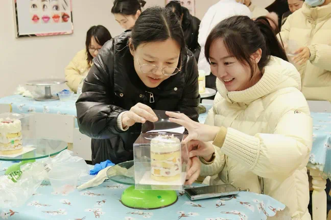 “轻轻涂抹,奶油要均匀。”蛋糕制作现场,师傅耐心示范,从奶油涂抹到裱花手法,再到水果搭配,老师们屏气细听,手中裱花袋微微颤抖,全神贯注创作。有人裱花失败,引得周围人轻笑;有人创意摆放水果,立刻分享经验。一时间,欢声笑语不断,蛋糕在大家的巧手下逐渐成型,香甜气息弥漫,每一份作品都饱含着老师们的心意,温馨又暖人。