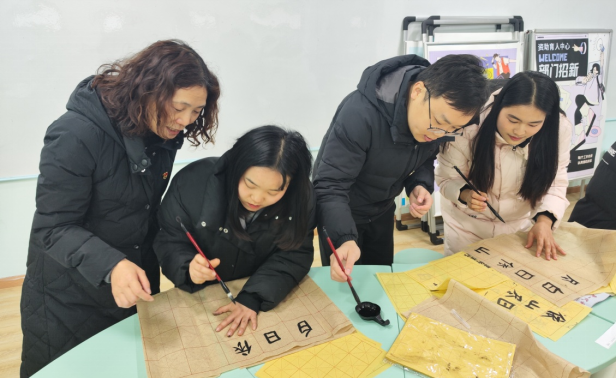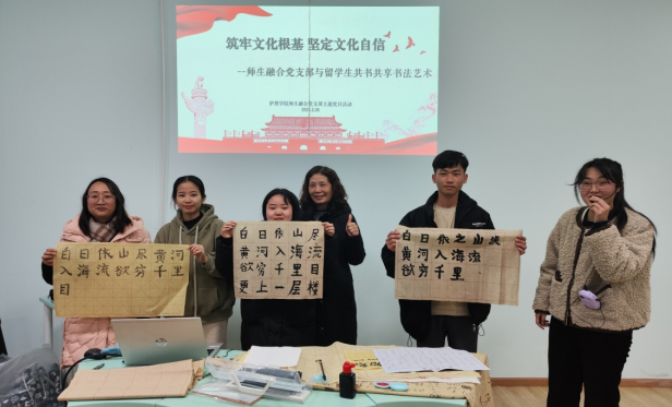 护理学院师生融合党支部以“书法艺术”为主题,组织教师党员与老挝留学生一对一结对练习“永”字八法,共吟同书中华古典诗词,师生在书写吟诵中体验中华传统文化精髓。