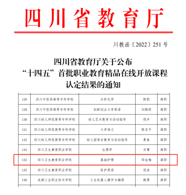 近日,四川省教育厅公布了“十四五”首批职业教育精品在线开放课程认定结果,共认定精品在线开放课程150门,培育课程40门。护理学院《基础护理》课程成功认定为四川省“十四五”首批职业教育精品在线开放课程。