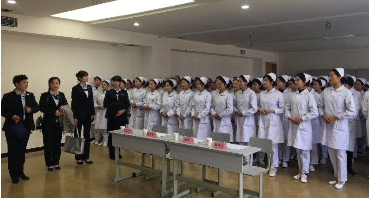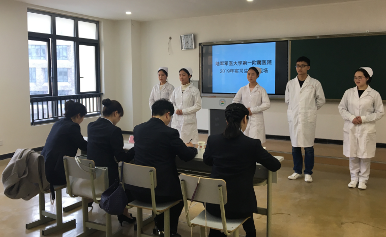 陆军军医大学第一附属医院护理处总护士长胡绍毅、整形美容科护士长刘莎、护理处助理周巧宁以及泌尿外科教学组长卞先莲四位专家亲临我院,对2017级自愿报名到陆军军医大学第一附属医院实习的114名学生进行选拔,选拔工作在3号楼B310进行。面试过程中,同学们个个精神饱满,对专家提出的问题有条不紊的进行了回答,面试现场气氛轻松和谐,最终25名学生成功入选。