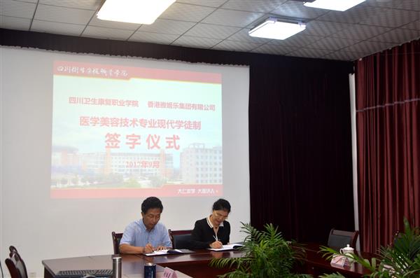 罗天蔚副院长出席并主持此次签约仪式。曾晓奇院长向来宾介绍了自贡及学院的基本情况,并就合作过程中可能出现的问题,提出了建设性意见,表示愿意以学生更好就业为目的,同香港雅姬乐集团有限公司在促进学生对行业认知、扎实基本功、对行业高端仪器使用等方面深化合作,为培养医学美容专业高端人才,促进行业发展 共 同 努 力 。