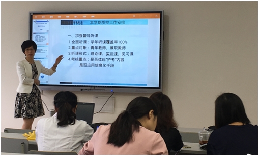 会议首先由邹金梅介绍了教务处及护理系各管理岗位分工;她还通报了专业建设、质控工作等专项工作安排,对专业市场调研、完善课程标准、课程建设、师资培养等安排做了详细的指导,尤其是对系部质控管理提出了新的思考和安排。随后刘琴和唐虹分别就分管的工作,布置了期初教学常规工作安排和见习安排工作;最后邹金梅特别提醒教师提前熟悉作息时间表和校历,组织师生提前熟悉上课路线及教室,以保证教学有序开展。她指出,搬进新校区,踏上新征程,要有新气象。
