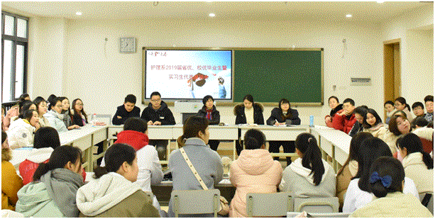 12月28日上午,护理系召开2019届优秀毕业生暨实习生代表座谈会。本次座谈会邀请了我系护理、助产、高职护理专业等9名优秀毕业生代表参加。护理系主任邹金梅、护理系副主任刘琴、各教研室主任、教师代表、护理系学工干事、实习辅导员以及40多名在校护理系学生代表参加此次座谈会。