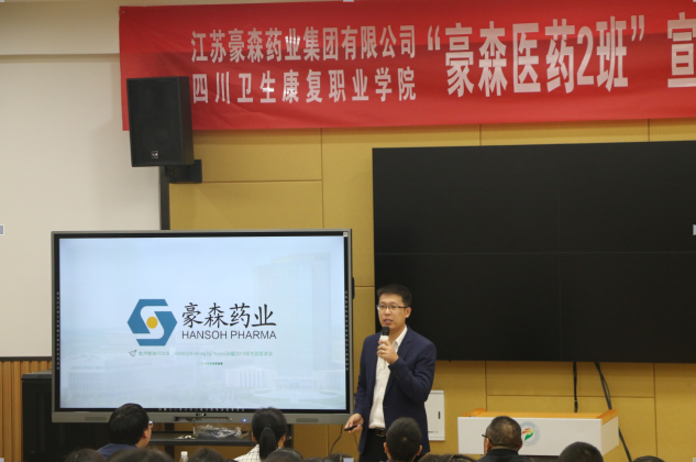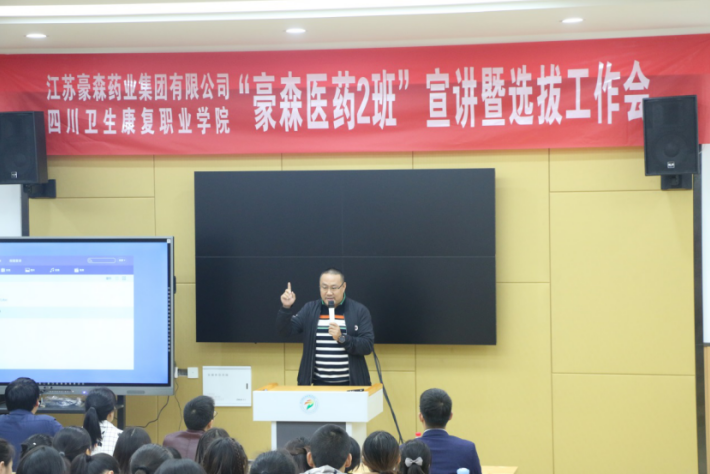 10月24日晚,学院与江苏豪森药业集团有限公司共同举办的“豪森医药2班”学员选拔工作会在1-B405隆重举行。江苏豪森药业集团有限公司四川川东区域经理徐文斌、自贡办经理张桥、人力资源部范旭东以及药学系师生共计200余人参加了此次活动。