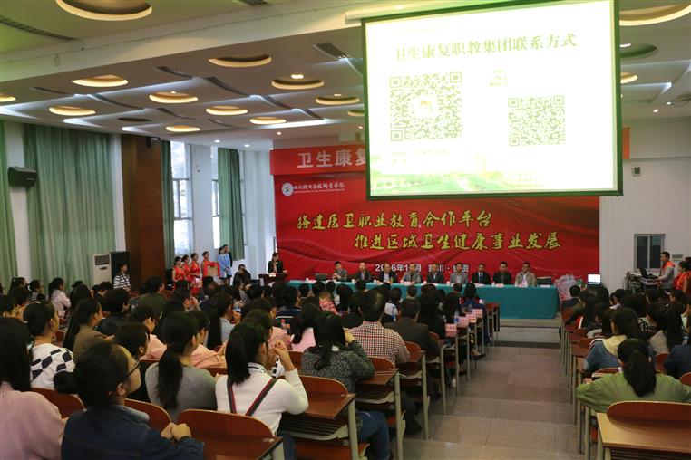 10月14日上午,卫生康复职业教育集团成立大会在taptap点点体育A113教室隆重举行。自贡市教育局副局长郭成钢、自贡市卫生计生委副主任邓昭红,市政府、市教育局、市卫计委有关科室的负责人,自贡市职业教育集团理事单位、自贡职业技术学校校长李浩平、副校长刘贻超,职教集团首届理事会33家成员单位的领导和嘉宾,学院领导班子成员和部分师生参加了会议。会议由学院副院长罗天蔚主持。