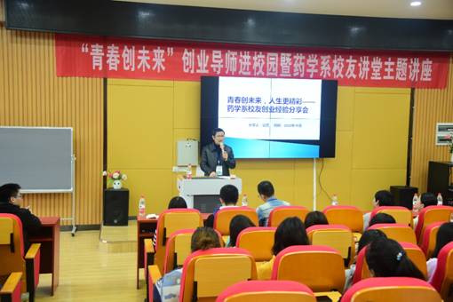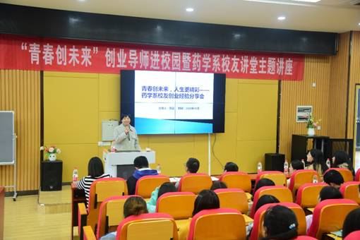 10月30日下午,由学院校团委牵头,药学系主办的“青春创未来”创业导师进校园暨药学系校友讲堂主题讲座在1-B401顺利举行。学院药学系优秀校友、国药集团药业股份有限公司商务经理、四川麦德凯大药房有限公司销售经理宗霞女士为同学们分享了创业经历和宝贵经验。药学系主任钟辉云、副主任杨光丽,校团委干事唐彬和近200名师生参加了此次讲座。