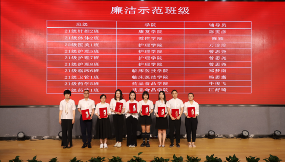 大会还为2021级针推2班等10个“廉洁示范班级”、覃燕丽等50名“廉洁大使”进行了颁奖。