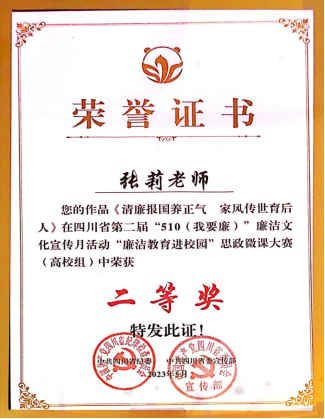 本次大赛旨在深入学习贯彻党的二十大和二十届中央纪委二次全会精神,贯彻落实中共中央办公厅《关于加强新时代廉洁文化建设的意见》,发挥思想政治理论课育人主渠道作用,促进廉洁理念入脑入心入行。大赛共收到全省高校135件作品(不分本专科),经过初赛、决赛等评比环节,最终评选出一等奖2名,二等奖4名,三等奖6名。张莉以崇廉尚洁、崇德尚善为主题,以赓续红色血脉、弘扬优良作风为主要内容,讲述了吴玉章同志清廉报国、家风传世的事迹,在入选决赛的40件高校作品中脱颖而出,荣获嘉奖。