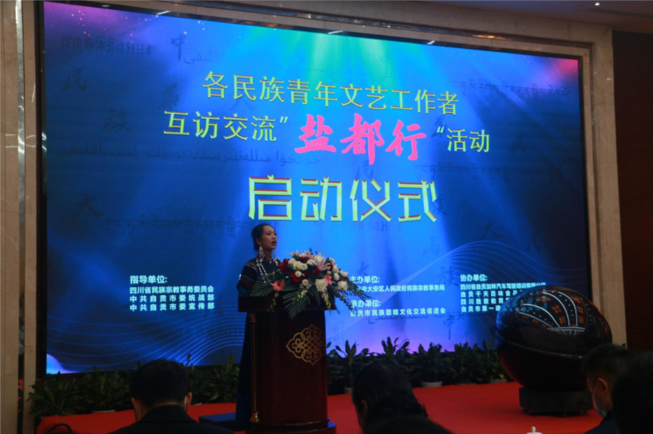 11月16日上午,由省民宗委、市委统战部、市委宣传部、市民宗局、市广电和旅游局、团市委指导,省民宗委相关领导、甘孜、阿坝、凉山、泸州、宜宾、乐山等市州民宗、文广旅游、团委等部门带队领导和各民族青年文艺工作者参加的各民族青年文艺工作者互访交流“盐都行”活动启动仪式暨新时代民族文化文艺发展交流论坛正式举行。