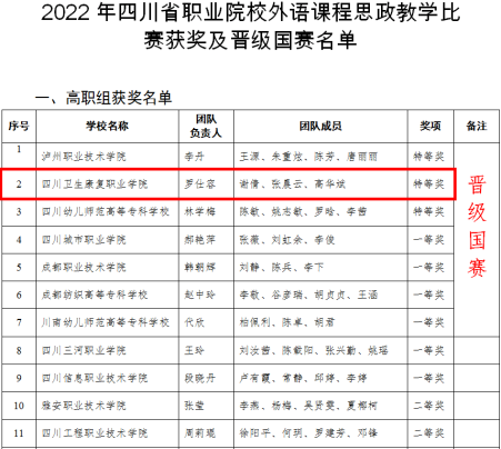 11月29日,2022 年四川省职业院校外语课程思政教学比赛省级获奖名单公布,教育体育学院英语教师罗仕容带领参赛团队(罗仕容、谢倩、张晨云、高华斌)经初赛、复赛激烈角逐,从全省101个参赛团队中脱颖而出,斩获四川省高职组“特等奖”,并赢得“优秀组织奖”,同时顺利入围全国总决赛。