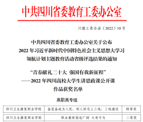 近期,中共四川省委教育工委公布了2022年习近平新时代中国特色社会主义思想大学习领航计划主题教育活动评选结果,马克思主义学院教师团队指导的“大学生讲思政课”2项作品斩获高职高专组特等奖和二等奖,指导的“我心中的思政课”1项微视频作品斩获一等奖(不分本专科)。