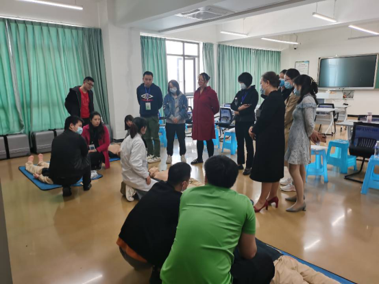 参训老师们认真听讲、仔细观摩、积极参与,在心肺复苏模拟人上进行操作,在练习过程中根据测试器数据不断调整自己心肺复苏术的按压动作、力度与频率,指导教师为其亲身示范,悉心指导,帮助提高动作规范性。
