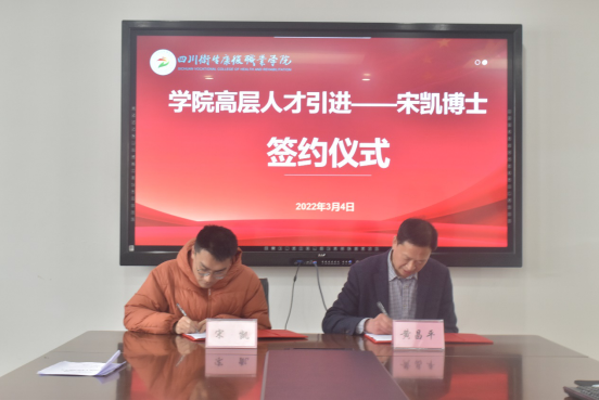 3月4日上午,在学校会议室,举行宋凯博士签约仪式,党委书记刘建辉、校长黄昌平、副校长申奎出席仪式。据悉,宋凯博士毕业于成都中医药大学针灸推拿专业,研究方向为针灸治疗脑病的临床及机制研究,多次在SCI及国内核心期刊公开发表学术论文。