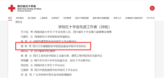 近日,药品食品学院学生科科长唐彬老师先后荣获四川省红十字会2021年度学校红会先进工作者(全省共29名),四川省青年志愿服务优秀工作者称号(全省共50名,自贡市仅1名)。