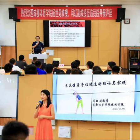 台上诠释体育精神,台下提笔铭记于心。近日,成都体育学院博士生导师杨世勇教授和国家级社会体育指导员闫虹副教授莅临我院,在1-B301为全院师生带来了一场“健康+运动”的知识盛会,人文社科部教师代表和学生代表参加。