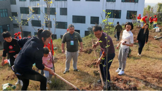 挥锹铲土、扶苗填坑、浇水灌溉、认领签名。植树现场,大家两人一组,三五一拨,各司其职、干劲十足。合力栽了一株株树苗,现场一派火热朝天的忙碌景象。经过一上午的辛勤劳动,腊梅、桃花、红枫、海棠、玉兰等50株树苗,在“青植园”扎根安家。学院后山被装点得绿意盎然、生机勃勃,放眼望去,一棵棵树苗成为学院一道靓丽的风景线。