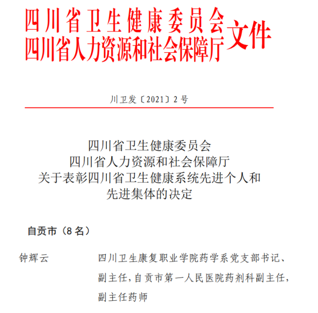近日,省卫生健康委、省人力资源社会保障厅表彰了一批四川省卫生健康系统的先进典型。在此次表彰的全省200名先进典型中,我院药学系主任钟辉云获此殊荣。据悉,自贡市仅8人获得表彰。