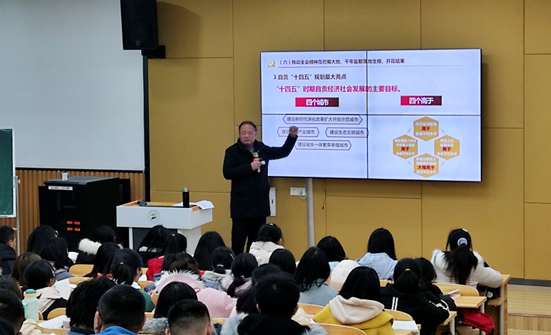 按照教育部关于通过“形势与政策”课开展党的十九届五中全会精神专题教学的通知,积极引导我院师生自觉把思想和行动统一到全会精神上来,1月8日下午,学院党委书记刘建辉走进“形势与政策”大课堂,为2020级针灸推拿1、2班学生及青年教师代表120余人宣讲党的十九届五中全会精神。