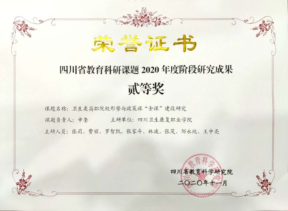 近日,四川省教育科学研究院公布了四川省教育科研课题2020年度阶段成果获奖名单,我院申奎主持、思政部教师主研的《卫生类高职院校形势与政策课“金课”建设研究》课题在299项参评课题中脱颖而出,斩获二等奖。