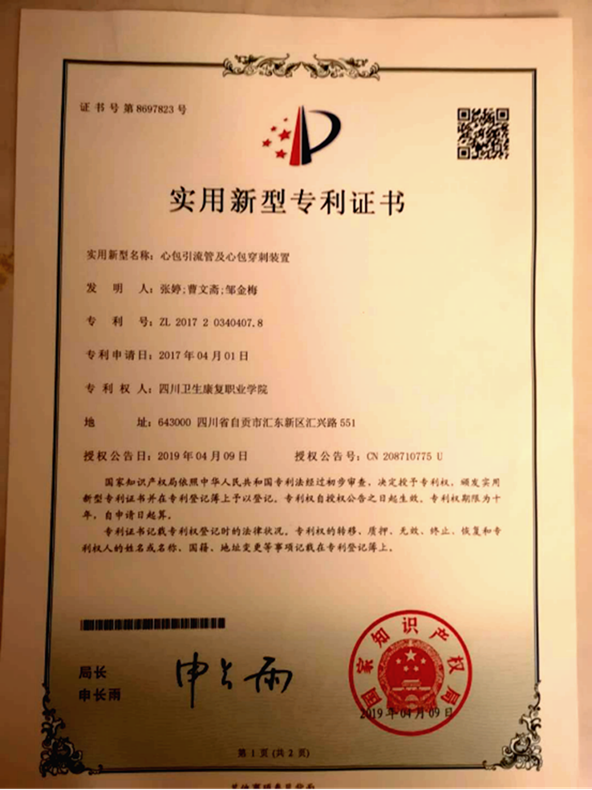 近日,我院教师张婷、曹文斋、邹金梅申报的《心包引流管及心包穿刺装置》实用新型专利,经过国家知识产权局的审查,获得国家知识产权局颁发的实用新型专利证书。