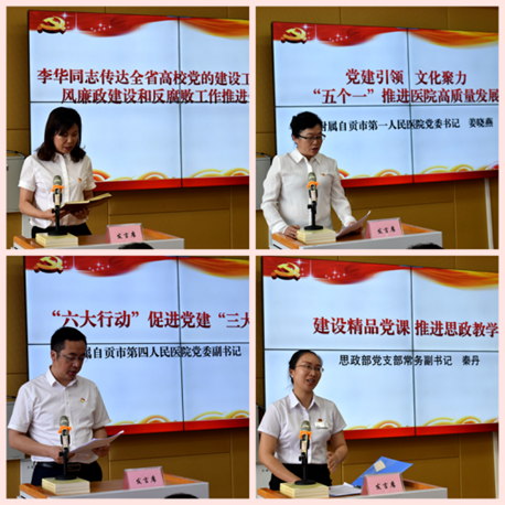 在党建暨党风廉政建设工作会上,学院党委副书记、纪委书记李华传达了全省高校党的建设工作会、党风廉政建设和反腐败工作推进会精神;附属一医院党委书记姜晓燕以《党建引领 文化聚力“五个一”推进医院高质量发展》为题,就文化建设进行了交流;附属四医院党委副书记、副院长邱桂刚以《“六大行动”促进党建“三大转变”》为题,就党建示范建设进行了交流发言;学院思政部党支部常务副书记秦丹以《建设精品党课 推进思政教学》为题,分享了思政教学工作体会。
