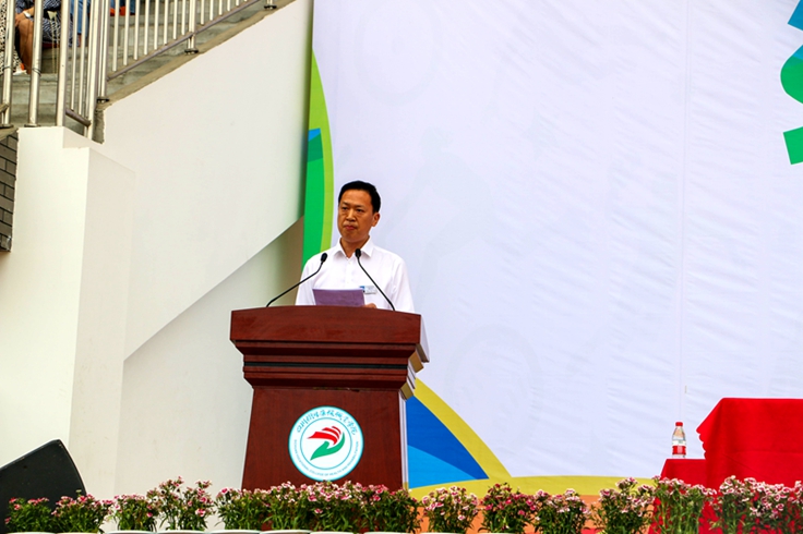 升国旗、奏国歌后,党委书记刘建辉致开幕词,他希望全体参赛运动员要赛出水平、赛出风格,全体裁判员、工作人员要忠于职守、公正裁判、热情服务,没有比赛的同学要文明参观、主动服务。