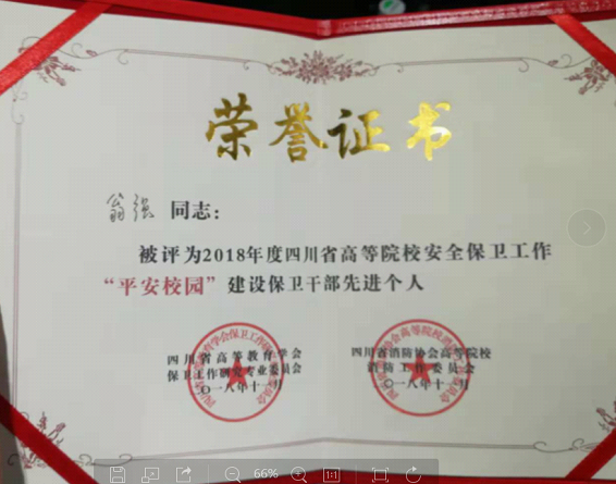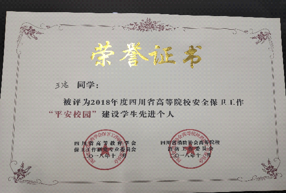 此外,翁强同志被评为2018年度四川省高等院校安全保卫工作“平安校园”建设保卫干部先进个人,刘旭东同志被评为2018年度四川省高等院校安全保卫工作“平安校园”建设保安先进个人,田姜、王洁同学被评为2018年度四川省高等院校安全保卫工作“平安校园”建设学生先进个人。