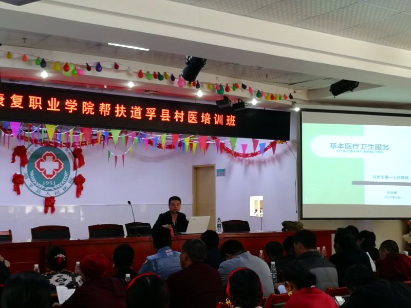 学院附属自贡市第一人民医院康复科副主任医师王关杰、健康管理科副主任医师宫吴健,附属自贡市第四人民医院门诊办公室主任张发强、急诊科副主任江从兵等根据道孚县乡村医生医学知识底子薄,临床实操能力弱的短板,认真遴选适合参培人员的授课内容,并结合自己从医多年的丰富经验,用最质朴的语言向村医们形象生动地讲授了医疗政策法规、医患沟通、常见意外伤害、中医适宜技术、急危重症、合理用药等实用技术。讲授获得了参培人员的热烈掌声。