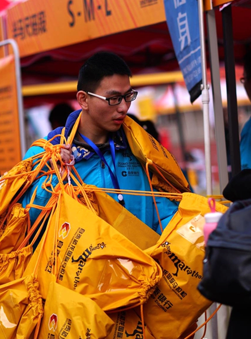 在起点处,我院志愿者们手拉手肩并肩组成人墙,维持现场秩序。存衣处的志愿者们齐心协力、不辞辛苦,努力记住每一位运动员衣物所在的位置。
