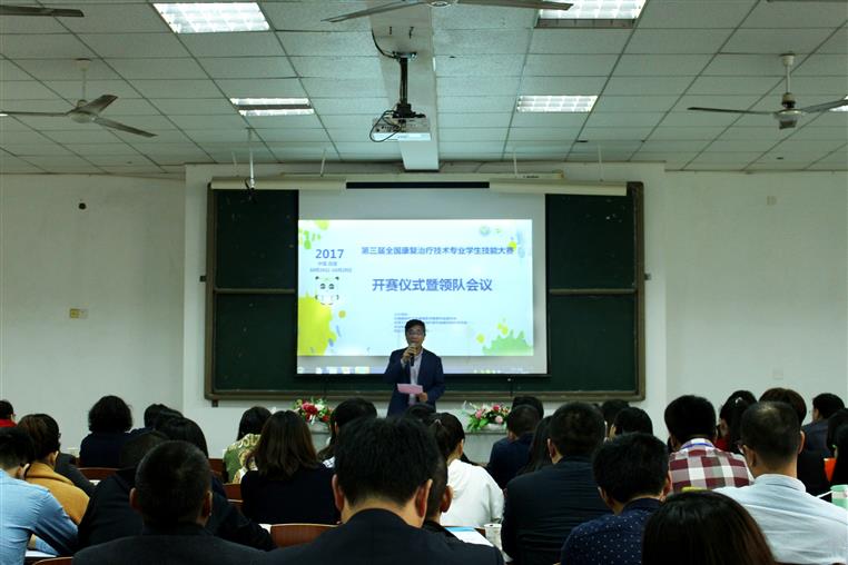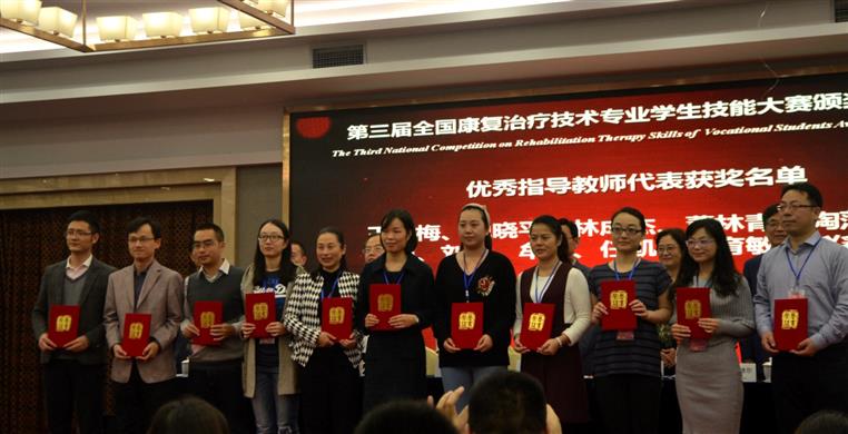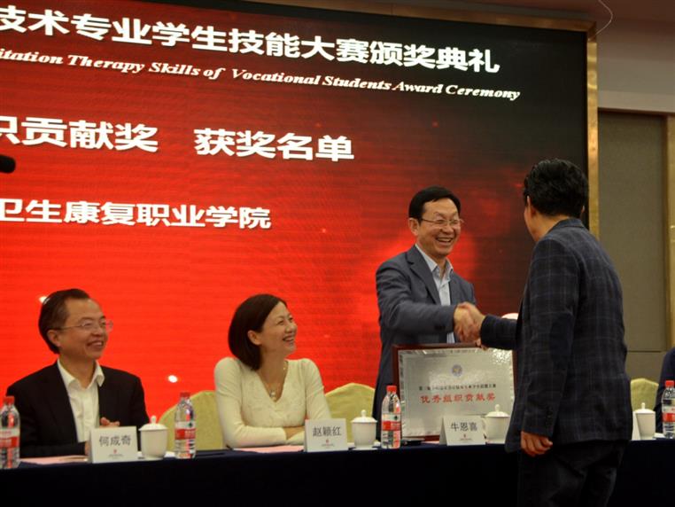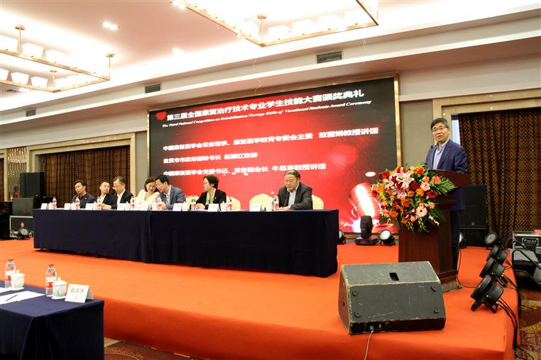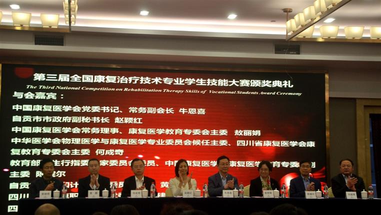 中国康复医学会党委书记、常务副会长牛恩喜,中国康复医学会常务理事、康复医学教育专委会主委敖丽娟,中华医学会物理医学与康复医学专业委员会候任主委、四川省康复医学会康复教育专委会主委何成奇等全国康复医疗及教育界知名专家教授亲临大赛指导。10月26日下午,全国卫生行指委康复治疗类专业教学指导委员会主任委员乔学斌教授代表本次大赛组委会在开赛仪式上讲话与各参赛院校加油鼓劲!随后教育部卫生行指委专家委员会委员、中国康复医学会康复医学教育专委会副主委兼康复治疗技术专业学组组长、本次大会执行主任陈健尔教授做了本次大赛的工作部署;中国康复医学会康复治疗专业委员会副主任委员王于领教授代表大赛评委会为参赛学校做赛事解答。在10月28日的颁奖仪式上,敖丽娟主委、自贡市政府副秘书长赵颖红分别代表中国康复医学会康复医学教育专委会、自贡市人民政府致辞,中国康复医学会党委书记、常务副会长牛恩喜代表中国康复医学会做重要讲话。随后陈健尔教授代表本次大赛组委会宣布比赛结果及获奖名单,各位专家以及市政府副秘书长赵颖红、市卫生计生委主任黄麟、学院党委书记刘建辉、院长曾晓奇为获奖队伍及个人颁奖。