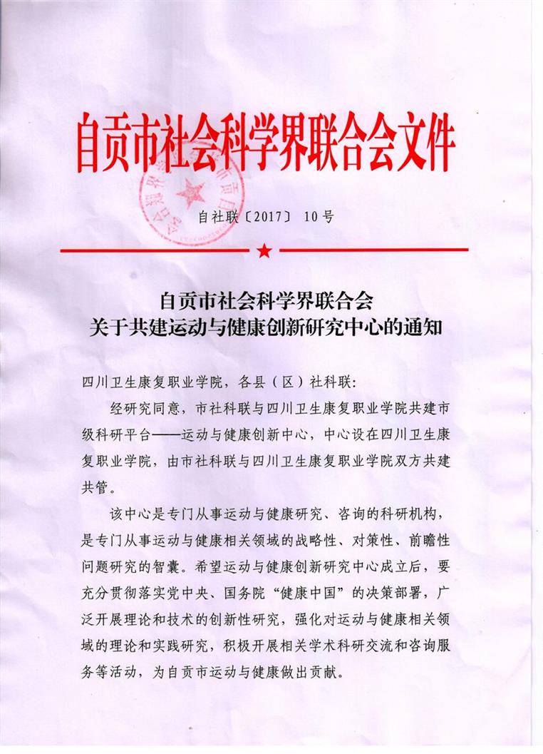 2017年6月,经自贡市社科联研究同意,我院首个市厅级科研平台——“运动与健康创新研究中心''成功获批。该中心的建立不仅标志着我院运动与健康研究在市厅级平台建设方面取得重要突破,也将极大地提升学院科研水平和社会影响力。