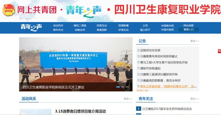 该网站分为青年之声和网上共青团两大板块,第一板块为青年之声,是学院青年学生发声的官方平台,学生可提问留言发声,和同学、老师、职能部门互动;第二板块为网上共青团,设有通知公告、青年关注、活动风采、团情联播、魅力团干、创新创业、原创作品名等栏目,可进行信息发布、下载资料、网上报名等,打造不下班的网上共青团。