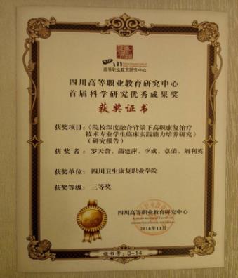 由学院副院长罗天蔚主持的《院校深度融合背景下的高职康复治疗技术专业学生临床实践能力培养研究》2014年8月在四川省高等职业教育研究中心成功立项为专项研究课题,2016年4月顺利结题。该课题在校企合作、工学结合的大背景下,探索出培养及提高康复治疗技术专业高职生临床实践能力的路径与方法,同时加深了对校企合作、工学结合及高职医学教育本质的认识。通过调研明确了专业定位,探索出“工学结合、渐进融入''的人才培养模式,完善了“递进式''的实践教学体系,构建“内容''与“形式''并重的二维课程体系;形成以“导学案''为载体的行动导向教学方法,同时探索了“院中校、校中院''的建设;形成从单一到综合层层递进,辅以专业技能竞赛的临床实践能力考评体系;建立“院中校、校中院'' 的实践教学基地,打造专兼结合的双师教学团队,保障人才培养质量,提高学生的临床实践能力。课题成果明显提高学生的临床实践能力,实践校企合作,教学相长,医院康复科与学院康复系实现双赢,学院教育、科研、培训、社会服务跃上新台阶。