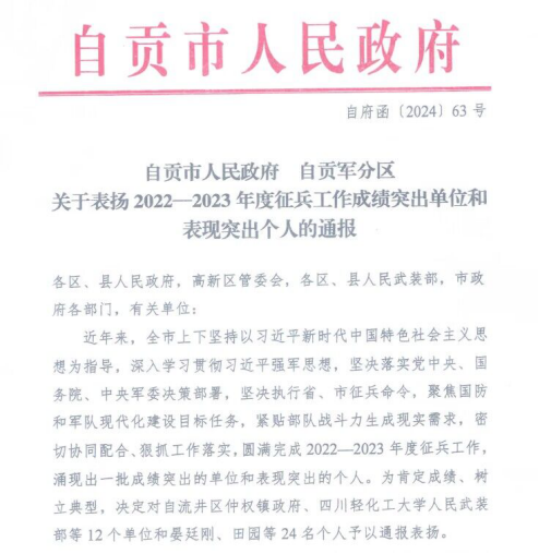 近日,自贡市人民政府、自贡军分区发布《关于表扬2022—2023年度征兵工作成绩突出单位和表现突出个人的通报》,taptap点点康复学院获评“全市大学生征兵工作成绩突出单位”。
