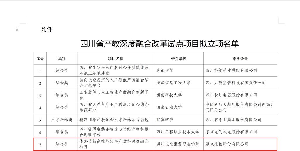 10月18日,四川省教育厅公示了“四川省产教深度融合改革试点项目拟立项名单”,在市委市政府的领导下,在市财政局、市教体局、市科技局、市经信局等部门的大力支持下,由学校与迈克生物股份有限公司联合申报的“体外诊断高性能装备产教科深度融合”项目,经过激烈角逐,从众多申报项目中突出重围,以高职院校排名第二的好成绩,成功入围拟立项名单。
