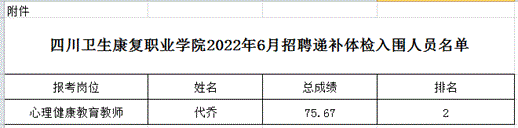 我院于2022年6月29日发布了《taptap点点体育2022年6月招聘工作人员考核成绩及体检入围名单公告》,其中1名(心理健康教育教师岗)体检入围人员放弃体检资格,根据《taptap点点体育招聘考试应聘者须知》等相关规定,经7月13日院长办公会研究决定,拟递补心理健康教育教师岗考核成绩第二名人员代乔进入体检环节,现予以公告(详见附件)。