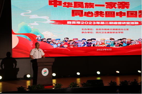 为大力弘扬中华传统美德,引领良好道德风尚,深入学习宣传贯彻党的二十大精神,6月21日下午,由自贡市精神文明建设办公室主办,我院承办的自贡市2023年第二期道德讲堂在3教C209报告厅举行。本期道德讲堂主题为“中华民族一家亲,同心共圆中国梦”。自贡市委宣传部四级调研员、公民思想道德建设科科长程建,四区两县文明办负责同志,自贡市公交集团有限责任公司代表及学院师生代表参加活动。