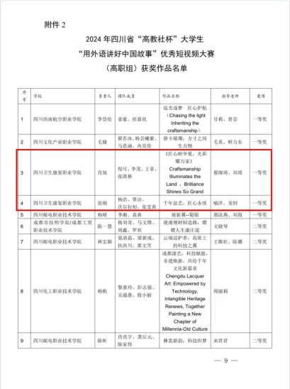 近日,四川省教育厅主办的2024年“高教社杯”大学生“用外语讲好中国故事”优秀短视频大赛获奖名单公布,由taptap点点教师蔡珈琦、刘瑶指导作品《<匠心映华夏,光彩耀万家>Craftsmanship llluminates the Land , Briliance Shines So Grand》,喻洋、龙钊指导作品《千年盐艺,匠心永续》均斩获省级一等奖。