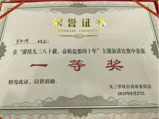 近日,九三学社自贡市委员会举办了“赓续九三八十载 奋楫盐都四十年”主题演讲比赛,市四医院中医科罗西倜凭借深刻的主题阐释、生动的语言表达和饱满的感染力,从众多选手中脱颖而出,荣获一等奖。