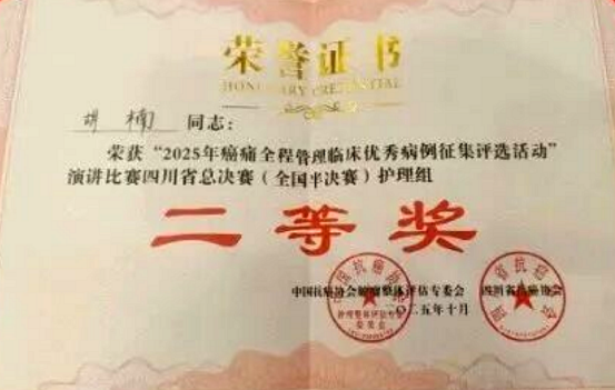 近日,“2025癌痛全程管理临床优秀病例征集评选活动”四川省总决赛(全国半决赛)在成都举行。肿瘤科胡楠护士在比赛中表现出色,其分享的癌痛管理病例,凭借科学的评估、个体化的治疗方案以及对患者心理支持与家庭关怀的细致阐述,在护理组激烈角逐中荣获二等奖。