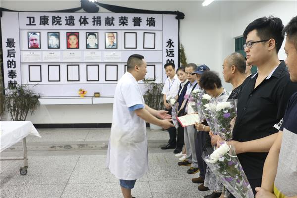 仪式由何福超主持,首先为张秀英同志默哀一分钟。接着张忠阳致悼词,并颁发红十字会遗体捐赠证书。他提到张秀英同志一生为祖国社会主义建设贡献力量,自结婚后,随丈夫南下建设,扎根在祖国西南。工作期间兢兢业业,生活中勤俭持家,为小家及大家均做出了巨大贡献。今年六月下旬,因病不幸离世,临终前她交代家人将自己的遗体捐赠给医疗机构,为祖国的医学教育事业发展做出最后贡献。简单朴实的话,透露出的确是无私奉献、克己奉公,爱国敬业的伟大精神。