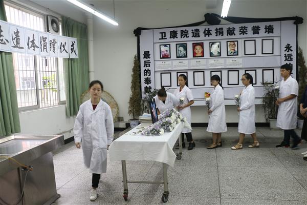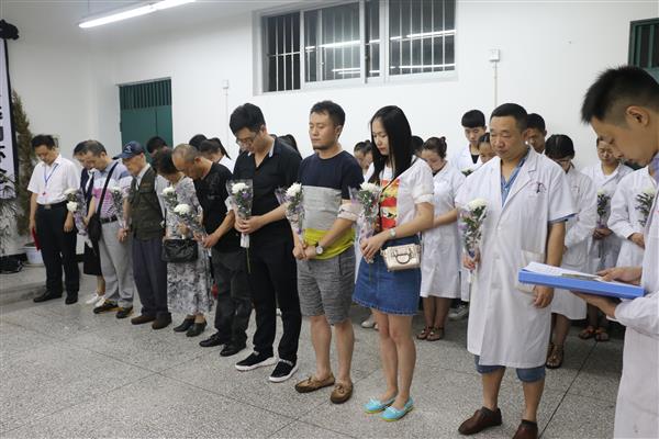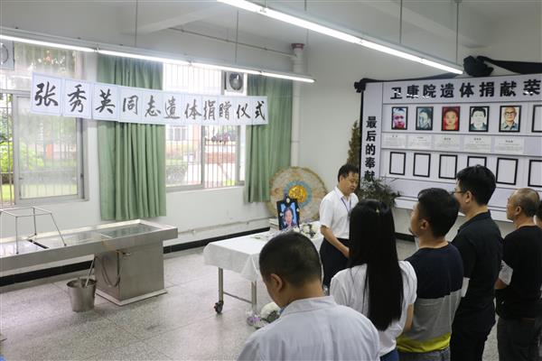 2017年6月24日9点,在我院A120遗体捐赠纪念室为张秀英同志举行遗体捐赠告别仪式,参加本次告别仪式的有张秀英的家属、自贡市红十字会主席张忠阳、基础医学部解剖教研室主任吴波、教师何福超、教师陈海旭和学生代表,现场秩序井然,庄严肃穆。