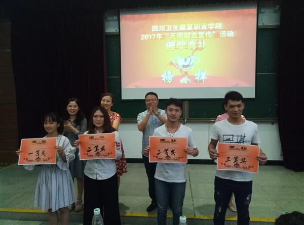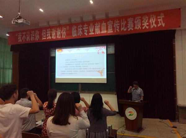 6月28日下午16:00,在A113举行了2017taptap点点体育临床专业无偿献血宣传比赛颁奖仪式。参加仪式的有自贡市中心血站副站长何刚,学院副院长罗天蔚,教务处副处长肖骞,基础医学部副主任李德英、段河军,基础医学部病理生理教研室主任程香,教师毛双法、李鹏杰、陈海旭,辅导员王巧碧、卢丽、徐伟、王超以及2016级临床专业全体学生。