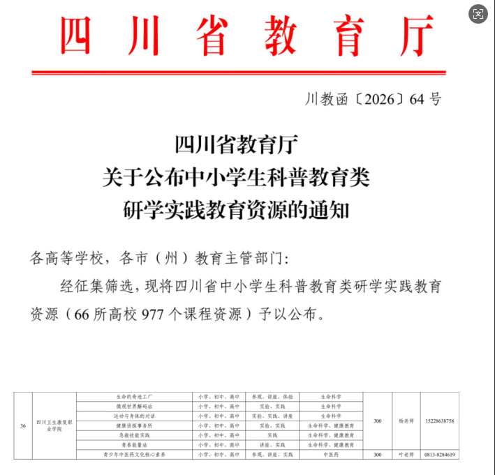 此次资源入选,充分体现了我院在科普育人能力与课程设计水平上的扎实功底。学院将以此次入选为契机,持续优化研学课程体系,完善实践教学条件,主动对接省内中小学研学需求,推动优质医学健康科普资源向基础教育阶段开放共享,为丰富四川省中小学生研学实践教育资源供给、提升青少年科学素养与健康意识贡献川康力量。