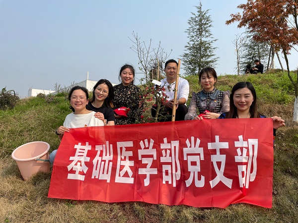 2022年3月11日下午,为迎接第44个全民义务植树节的到来,基础医学部党支部与学校团委共同开展了以“润川康青山,创文明校园”为主题的植树活动。支部派出由6名党员组成的植树小分队,前往学院后山进行植树,章荣院长参与了此次活动。