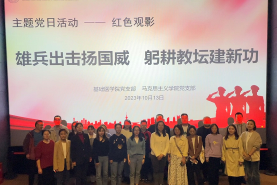 为深入开展学习贯彻习近平新时代中国特色社会主义思想,增强基层党组织的创造力、凝聚力和战斗力,坚定党员理想信念,充分发挥党员先锋模范作用。2023年10月13日,基础医学院党支部和马克思主义学院党支部联合开展“雄兵出击扬国威 躬耕教坛建新功”主题观影活动。