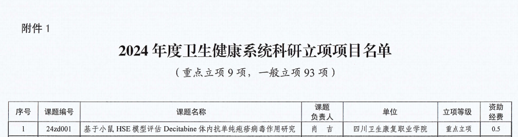 基础医学院基础医学研究实验中心博士肖吉和张修忠分别作为课题负责人与自贡市疾病预防控制中心科研人员合作申报市级重点科研项目《基于小鼠HSE模型评估Decitabine体内抗单纯疱疹病毒作用研究》《基于蛋白质组学筛选影响DENV-1复制的宿主因子》于2025年1月16日正式立项,双方共享科研平台资源及实验设备,配备必要的实验人员,保障科研项目顺利开展。