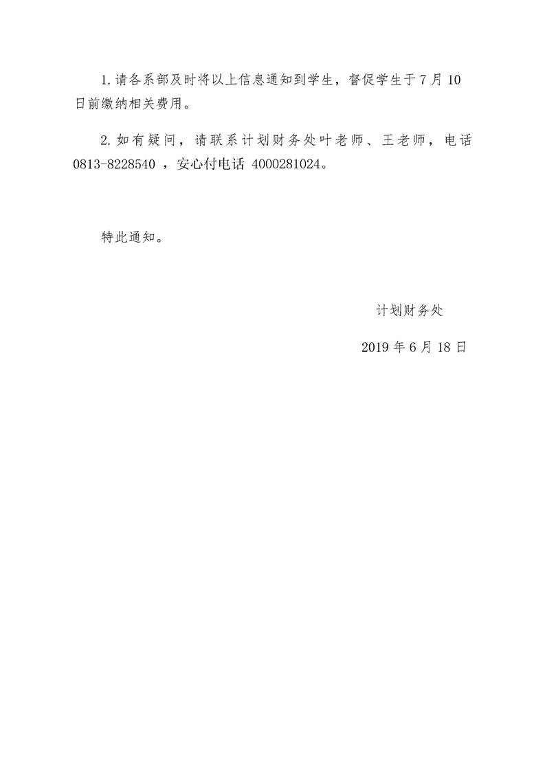 学院关于2019年实习学生缴纳学费、住宿费的通知