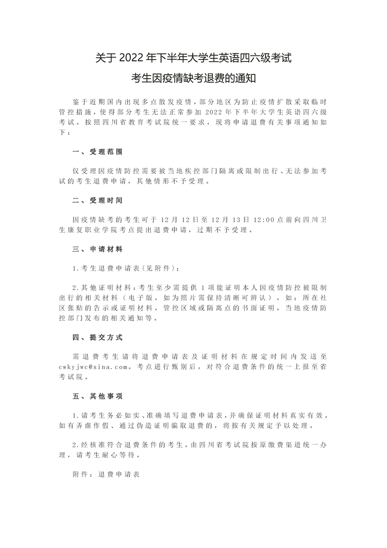 关于2022年下半年大学生英语四六级考试 考生因疫情缺考退费的通知